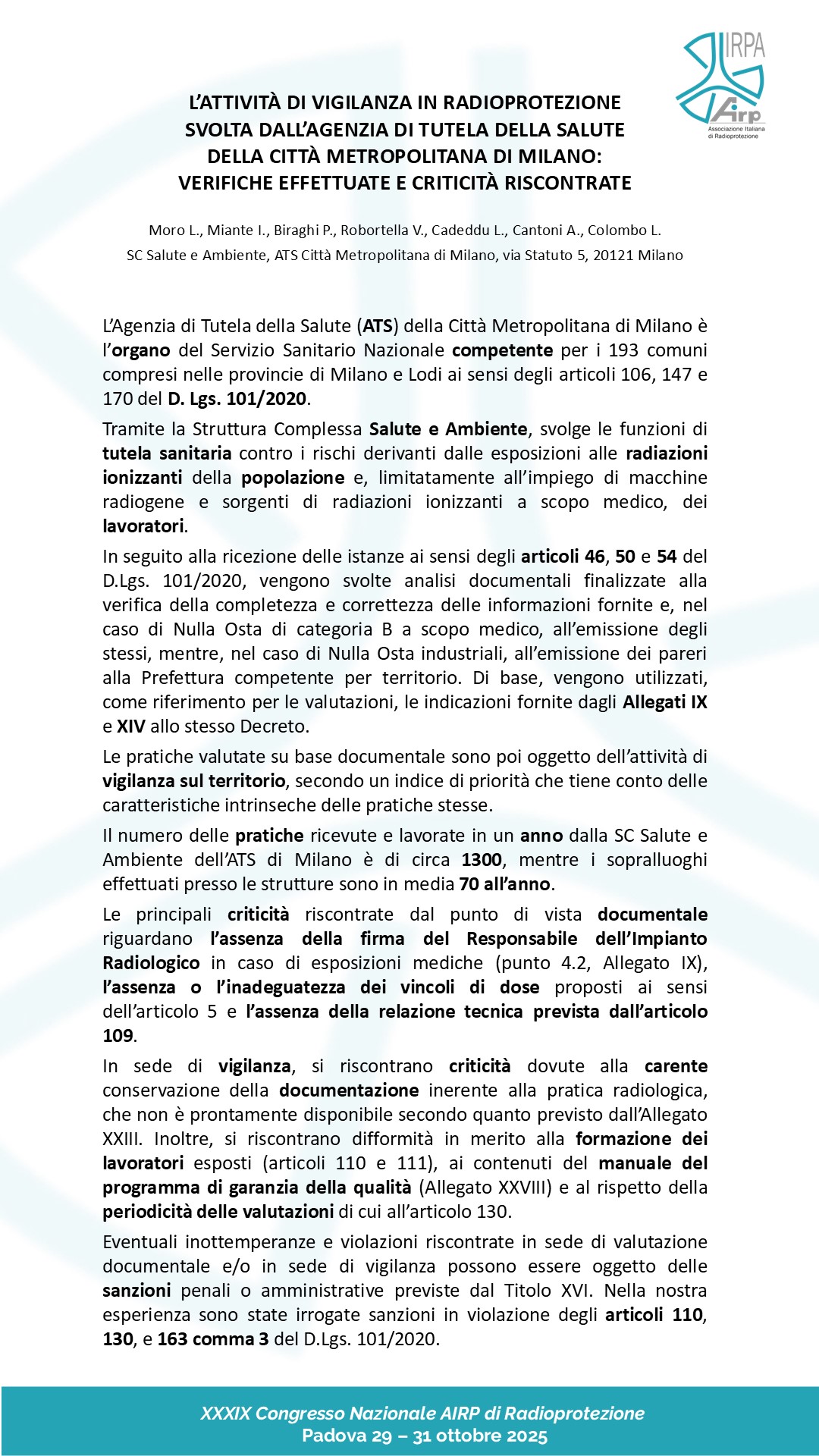 P1 - L’attività di vigilanza in radioprotezione svolta dall’Agenzia di Tutela della Salute della Città Metropolitana di Milano: verifiche effettuate e criticità riscontrate